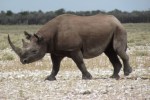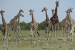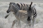 The black rhinoceros appeared from the trees as we stopped at a watering hole that was mobbed with oryx, springbok, zebra, jackals, impalas, and ostriches. He just kept on coming and presented us with a beautiful view of this elegant monster. We saw thousands of zebra including this mother that was still suckling and protecting this very large offspring. We visited a waterhole at the end of the day and saw a large posse of giraffes that were waiting for a herd of elephants to clear out of the way before they descended to drink.