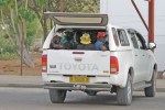 Public transport in rural Namibia is non-existent. The people we saw hanging about seeking the shade of a road sign, were waiting for a ride in whatever vehicle they could. This ubiquitous Toyota Hilux pickup at Khorixas had six guys hitching in the truck bed.
