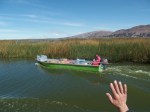 Photos: Jim Hyde getting lots of help from Miguelito flying the drone to film the islands – a demonstration of how the islands are built and the political hierarchy of the island from the president of this island – fresh reeds and fresh water being delivered (the lady delivering the water was not pleased to be photographed as she was breast feeding whilst driving) – one of the ladies doing embroidery for sale – tired visitors returning home.