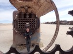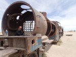 We had time to make a quick lunch stop here and Fonz and I found some shade inside the firebox of one old locomotive. As we left, one of the tour operators was clearly upset that we had ridden our go-anywhere bikes right up to the line of rusting hulks. Hey man this is a scrapyard, not the Smithsonian.
