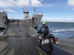 Today this is a very fast, friendly, and professional ferry trip across the narrow strait. Though it is definitely a challenge to ride a big bike onto the ferry across the surf and off again in a howling cross wind that is normal here. Commit or get wet.