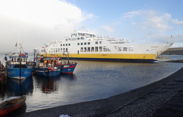 Finally the road lurched towards the coast and rocked and rolled around the headland. About 80 km of good rocky dirt road that plunged to the beaches then up the cliffs past remote houses with ancient boats pulled up; in and out of bright sun, in high winds, rain, hail, and sleet. Our Freezing Temps lights flashed. The wind and cold were uncomfortable and occasionally terrifying. We found the ferry tied up waiting for the 8:00am sailing, found a hotel, clean sheets, pisco sours, and Carménère red wine. WE HAD A BLAST.